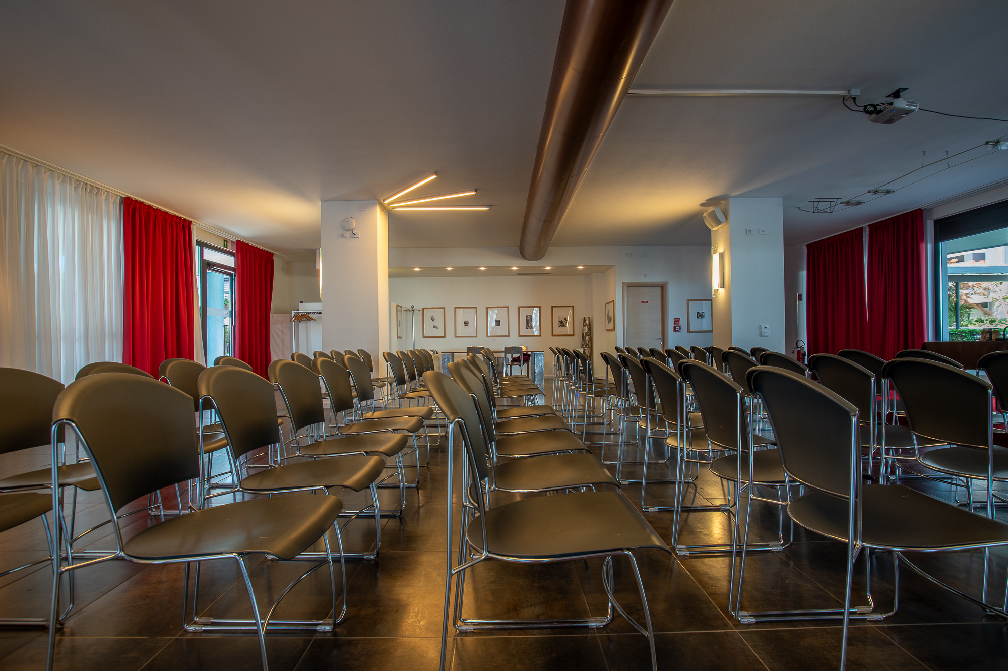 • Der Raum kann als Auditorium, in Hufeisenform oder mit Schulbänken eingerichtet werden