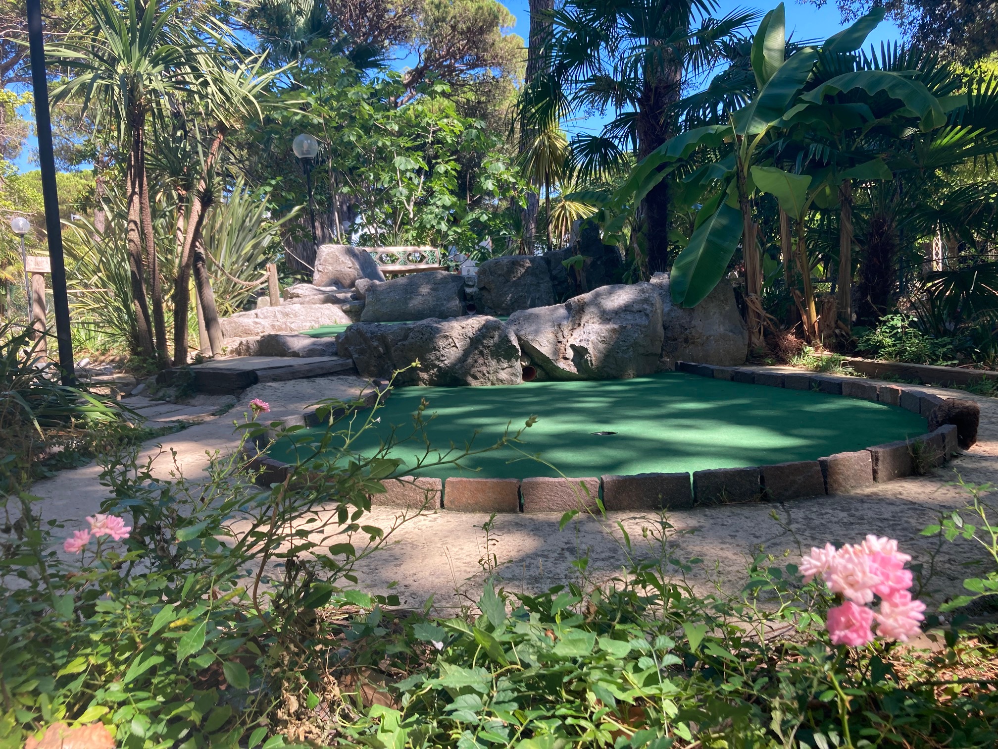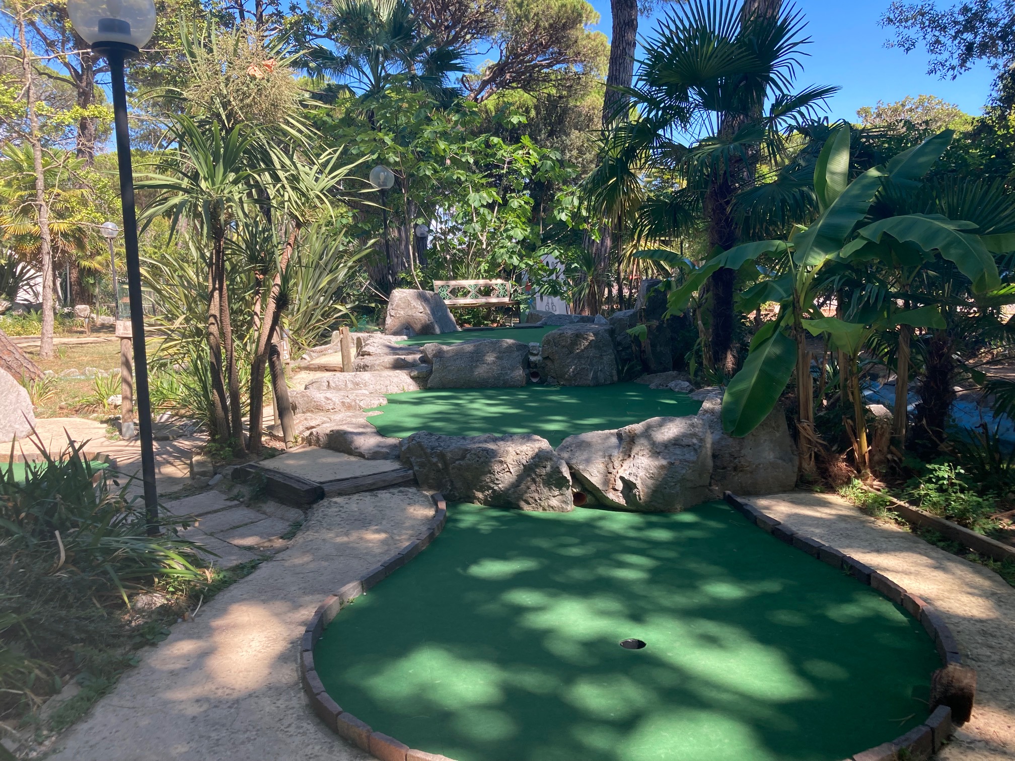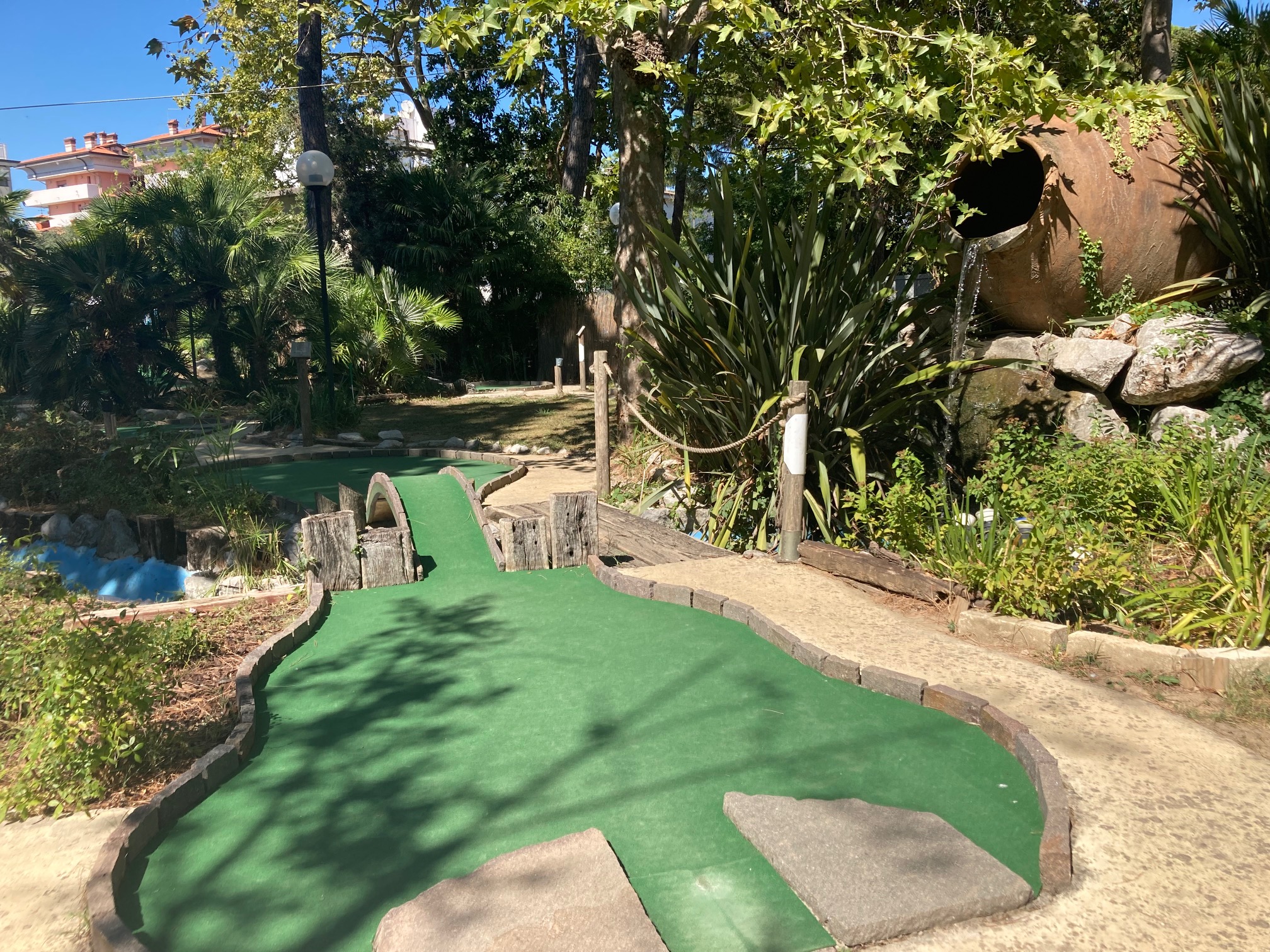 Minigolf "Adventure Golf" in Grado erstreckt sich über eine Fläche von 2.000 Quadratmetern in einem Blumengarten mit mediterranen und tropischen Pflanzen, einem Teich mit Wasserfall und Wasserspielen; am Abend entsteht dank der farbigen Beleuchtung eine gemütliche Atmosphäre und Spaß für die ganze Familie ist garantiert!