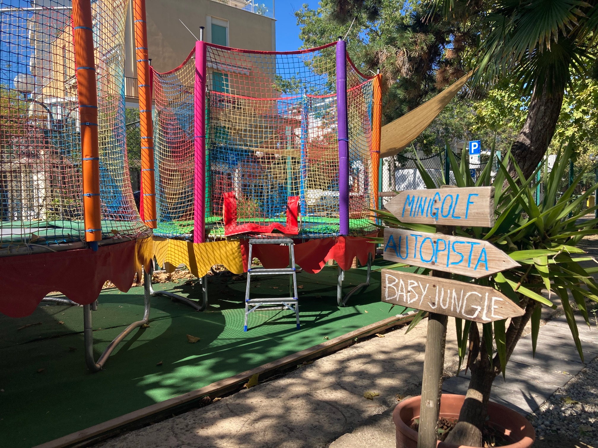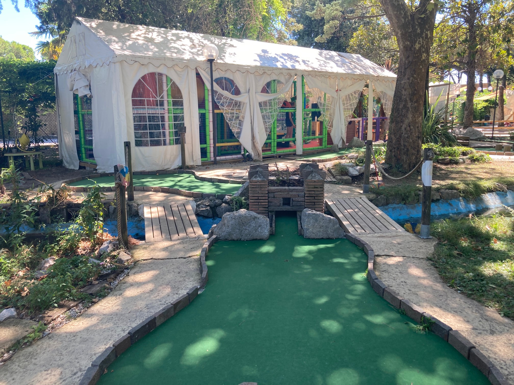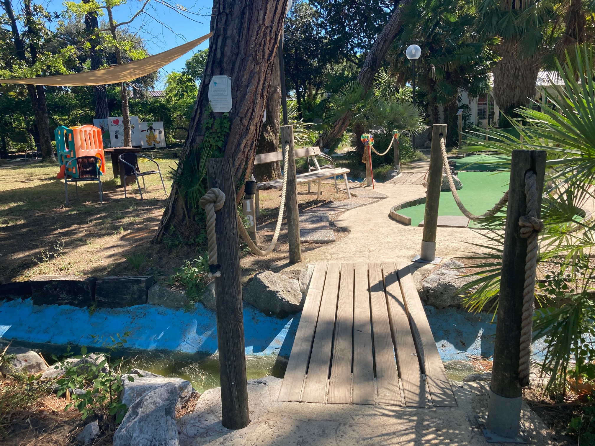 Minigolf "Adventure Golf" in Grado erstreckt sich über eine Fläche von 2.000 Quadratmetern in einem Blumengarten mit mediterranen und tropischen Pflanzen, einem Teich mit Wasserfall und Wasserspielen; am Abend entsteht dank der farbigen Beleuchtung eine gemütliche Atmosphäre und Spaß für die ganze Familie ist garantiert!