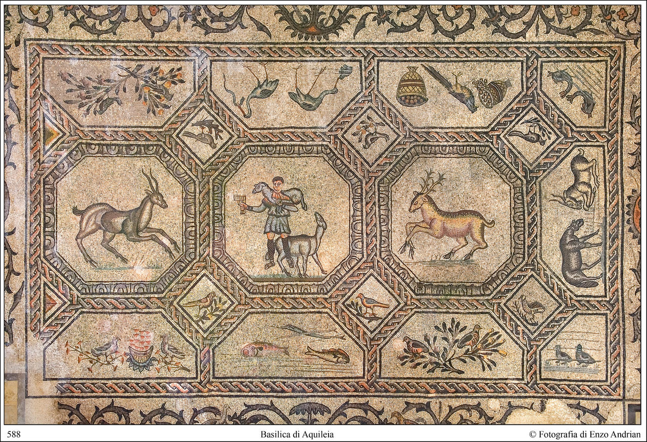 Wenn man die Basilika verlässt, findet man die Kirche der Heiden, deren Tür sich direkt gegenüber der Basilika befindet, und das mit ihr verbundene Post-Theodosianische Baptisterium. In der Südhalle des Baptisteriums können Sie die prächtigen Mosaikflächen bewundern, die den Bereich neben dem Baptisterium bedecken. Dank eines besonderen Schutzes können die bedeutenden Mosaikreste erhalten und besichtigt werden. Der in drei große rechteckige Felder unterteilte Boden, der den Raum des südlichen Saals des Baptisteriums wiedergibt, ist mit Motiven verziert, die auf die Aquileische Tradition zwischen dem Ende des 4. und dem Beginn des 5. Jahrhunderts n. Chr. zurückgehen.