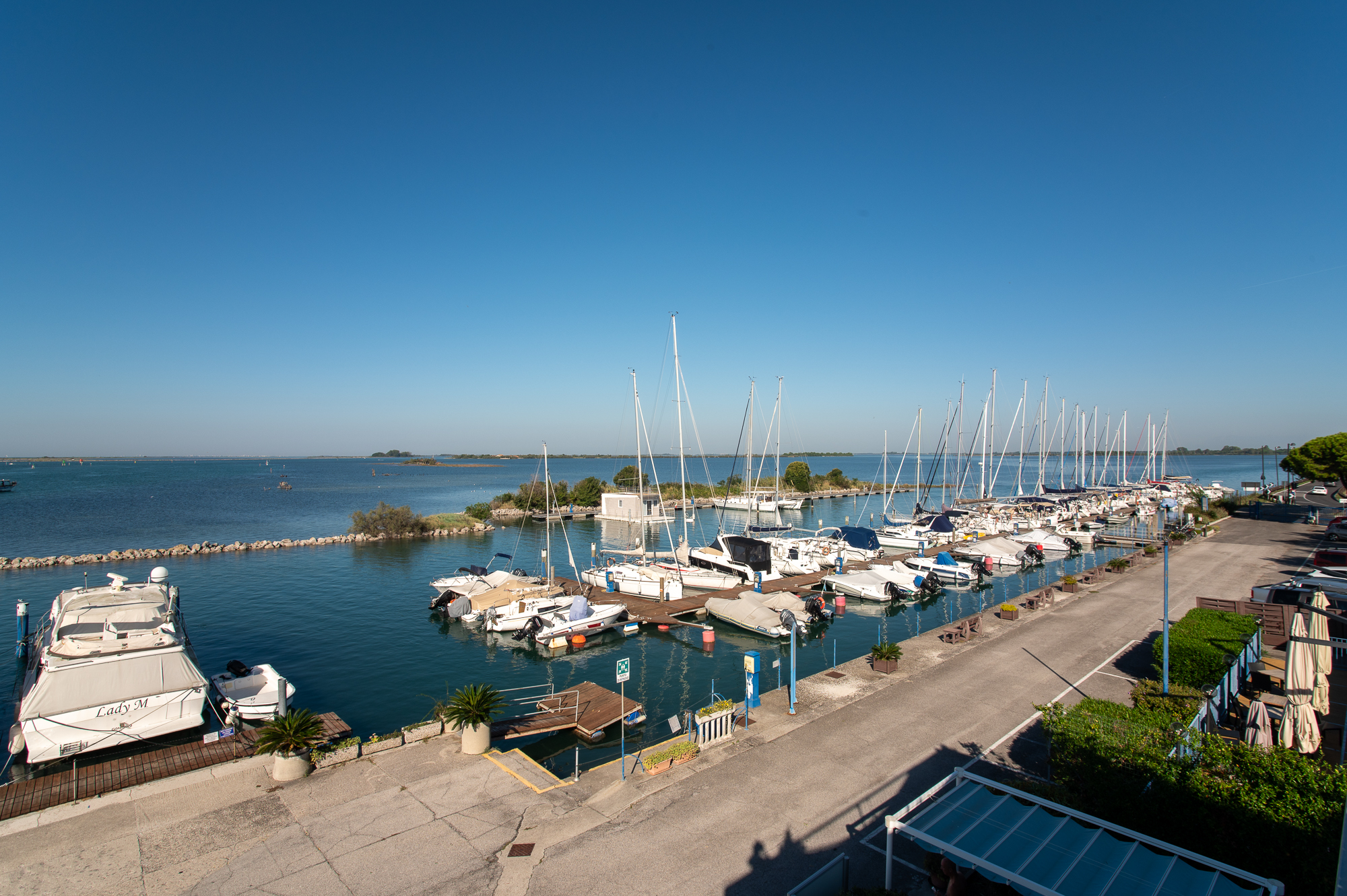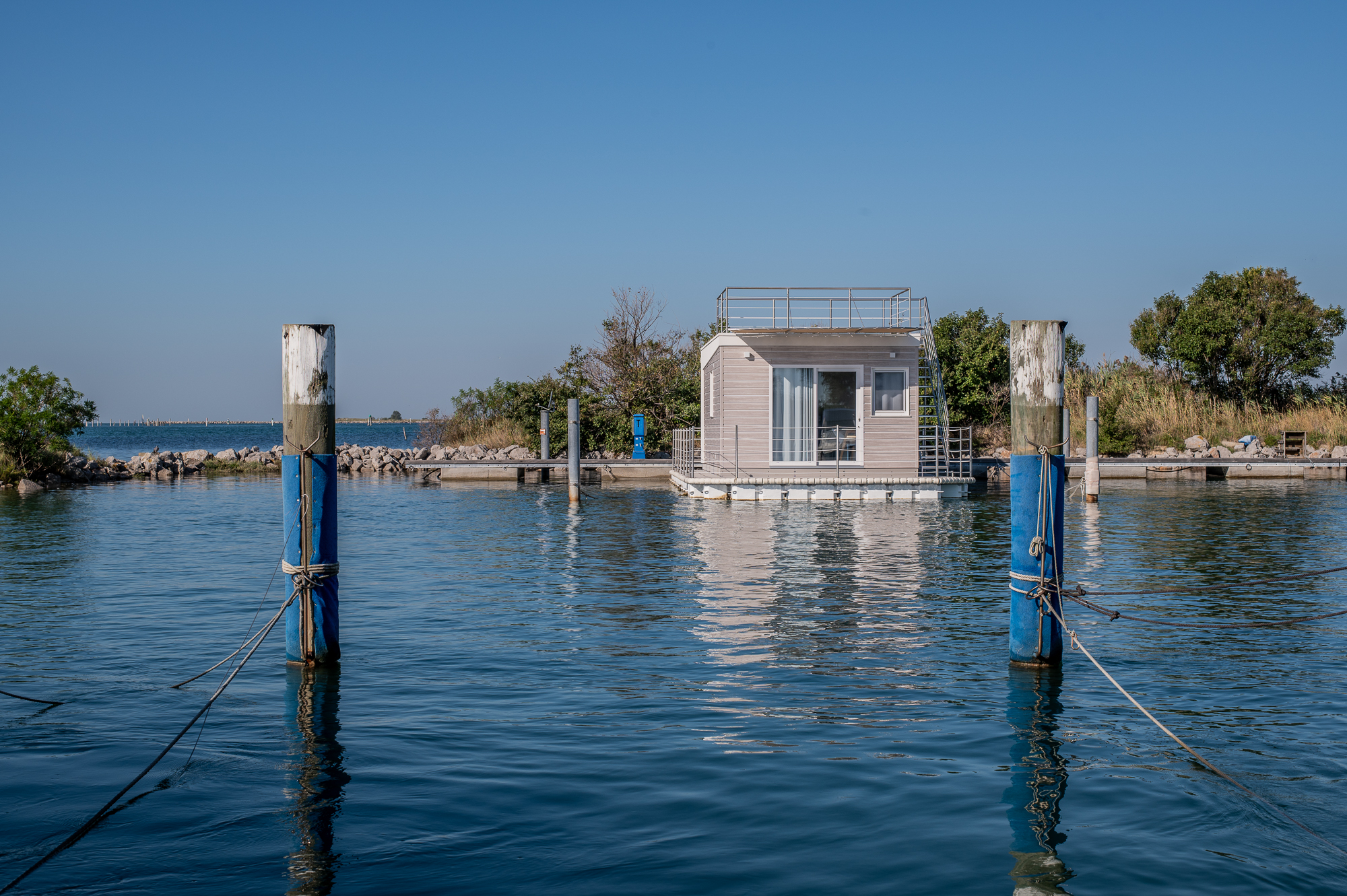 Die Bar und das Restaurant mit Pizzeria, die über eine Jahreslizenz und einen großen Parkplatz verfügen, haben eine große Terrasse mit einem weiten und eindrucksvollen Blick auf die Sonnenuntergänge über der Lagune.