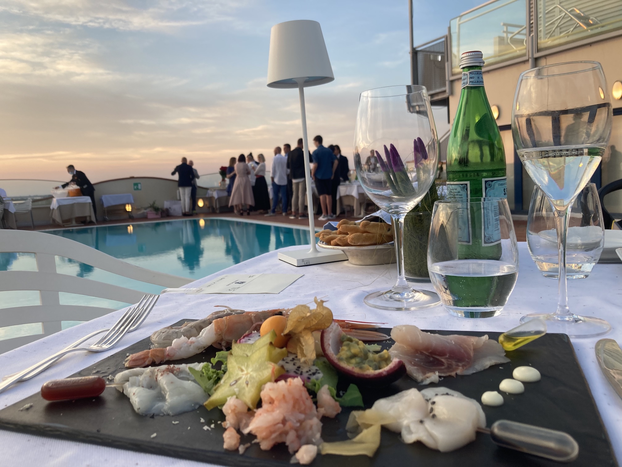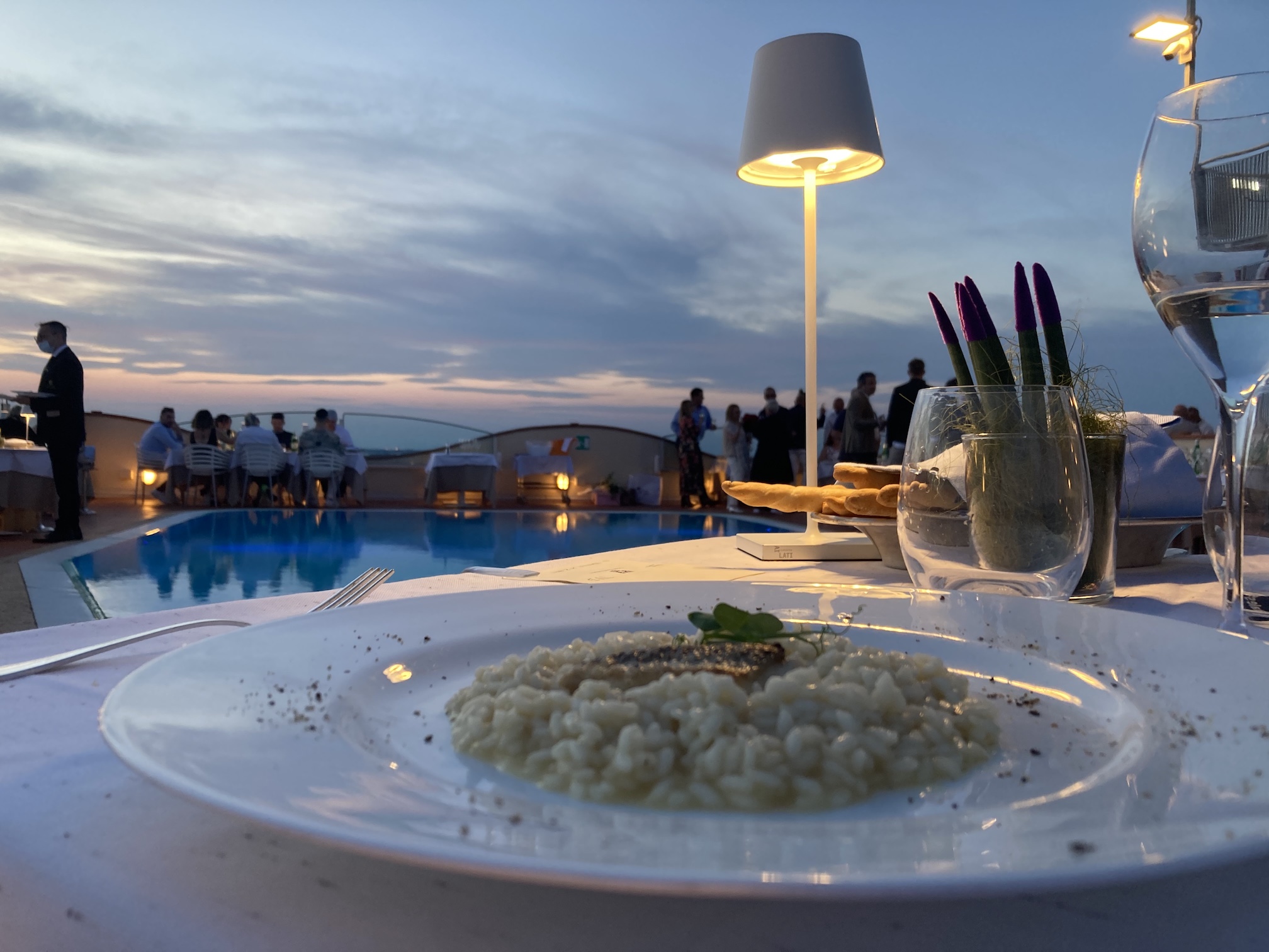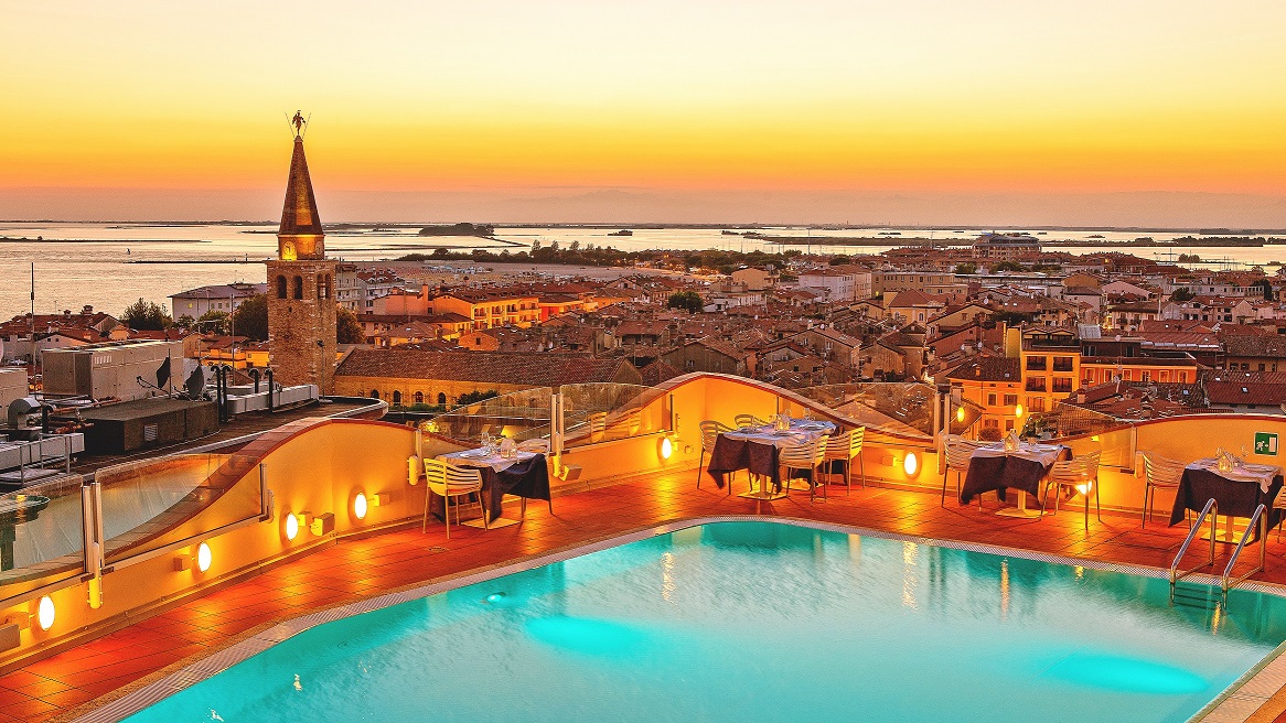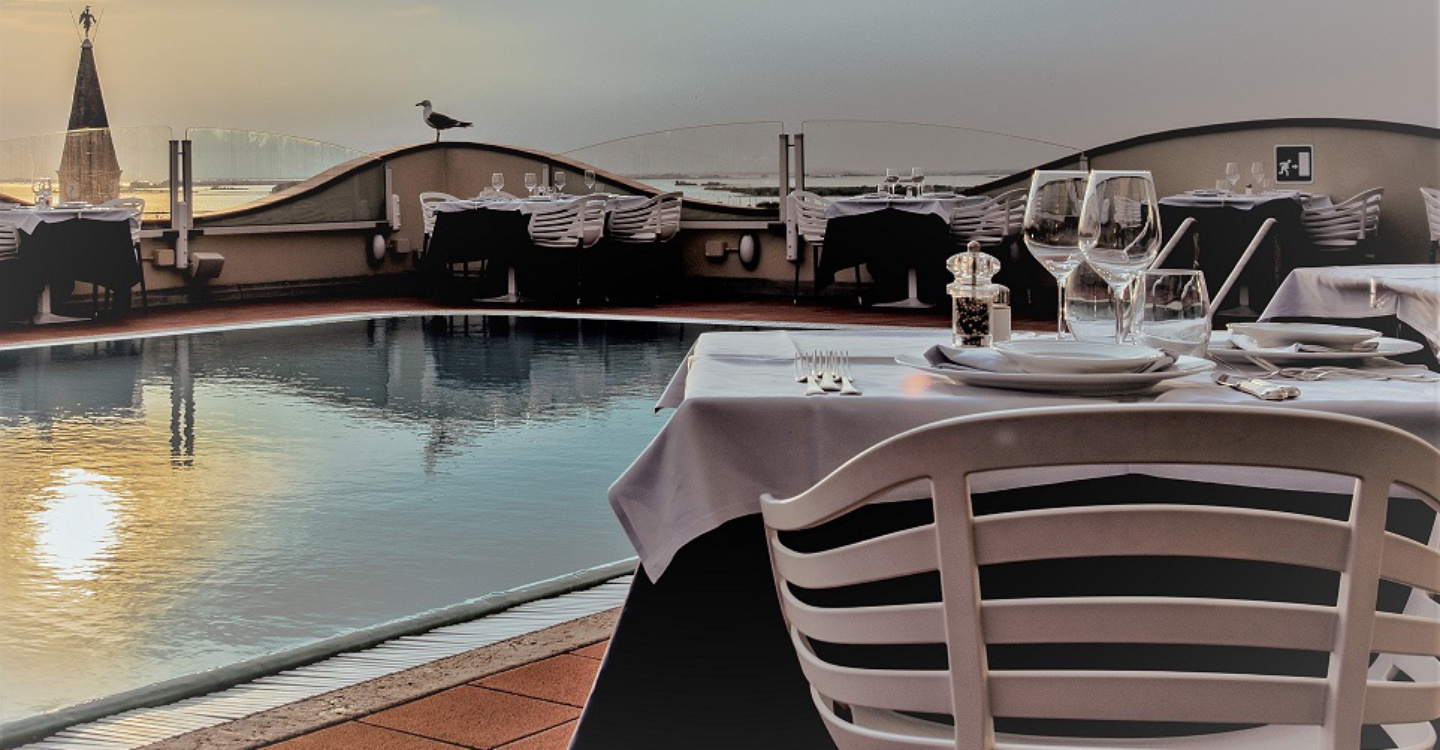 Un'incantevole terrazza al settimo piano, con vista impareggiabile su mare e sulla laguna, dove cenare a bordo piscina o all'interno, circondati da vetrate. Un menù incentrato sui prodotti tipici del territorio sapientemente abbinati agli ottimi vini friulani. Proposte e raffinate combinazioni di sapori anche per chi predilige piatti vegetariani o senza glutine.