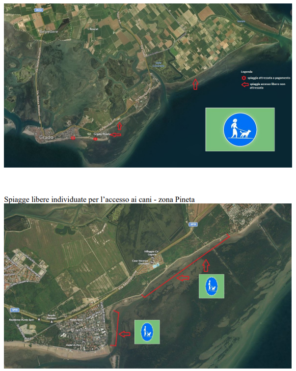 L’accesso dei cani è consentito negli stabilimenti appositamente autorizzati e nei 2/3 delle spiagge libere gratuite che, per il Comune di Grado, sono individuate nella planimetria qui di seguito